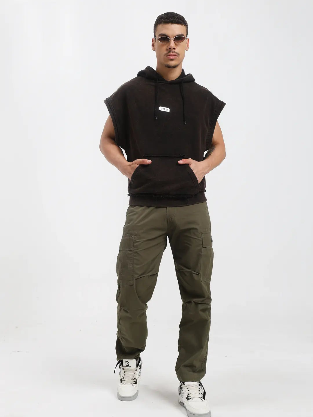 Crafted from heavyweight 350 GSM French terry, this sleeveless hoodie delivers structure with comfort. Acid-washed finish gives it a lived-in texture, with raw-edge detailing and a front kangaroo pocket. Completed with DVRZI’s metal plate on the chest, it’s made for relaxed layering with an edge.