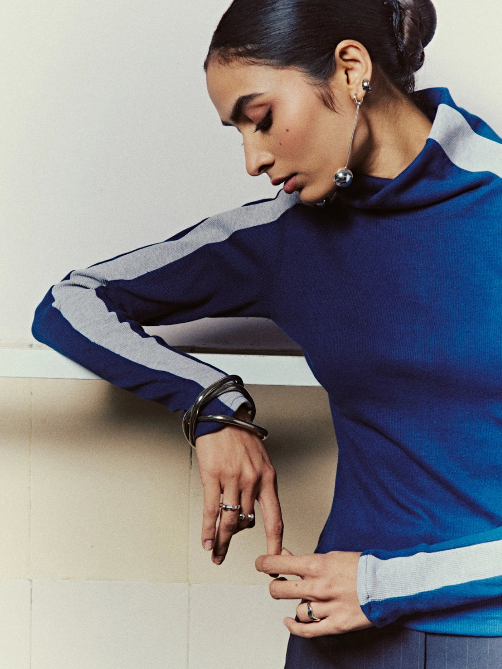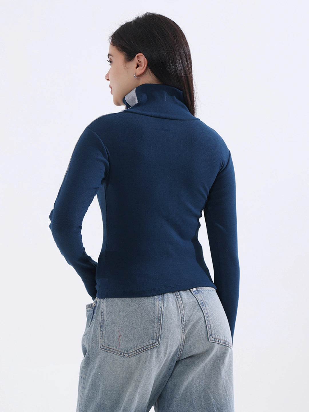 Ribbed with a loose foldable high neck & a contrast collar-to-sleeve stripe