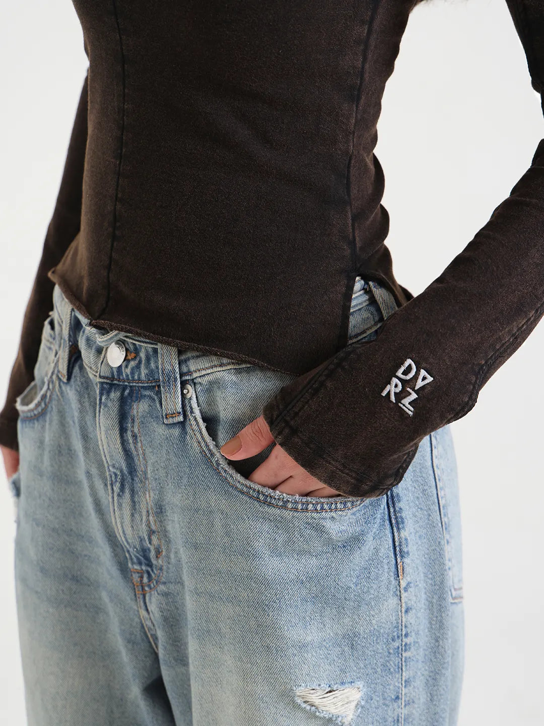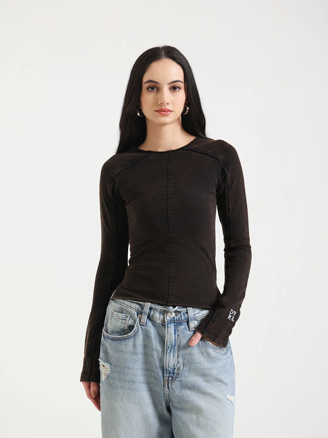 Made in 280 GSM cotton terry lycra, this fitted top is designed to move with the body while holding its shape. The fabric offers a soft, stretch-infused feel with enough weight for a structured silhouette. Raw seam detailing runs through the body, adding a subtle deconstructed edge without overpowering the look. The elongated sleeves and clean neckline keep it minimal, while the embroidered DVRZI branding on the cuff adds a quiet signature detail. Comfortable, versatile, and easy to style, it’s a refined everyday essential with an understated attitude.